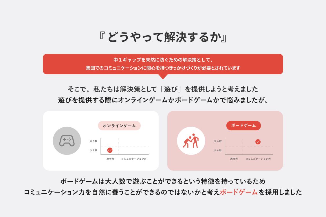 そこで、私たちは中1ギャップという問題を解決するためのアプローチとして”遊び”を提供しようと考えました。