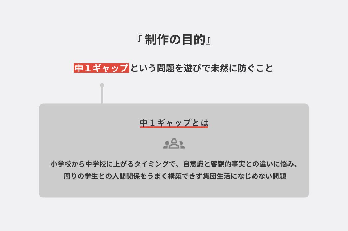 このゲームは中1ギャップという問題を未然に防ぐことを目標に制作しています。
